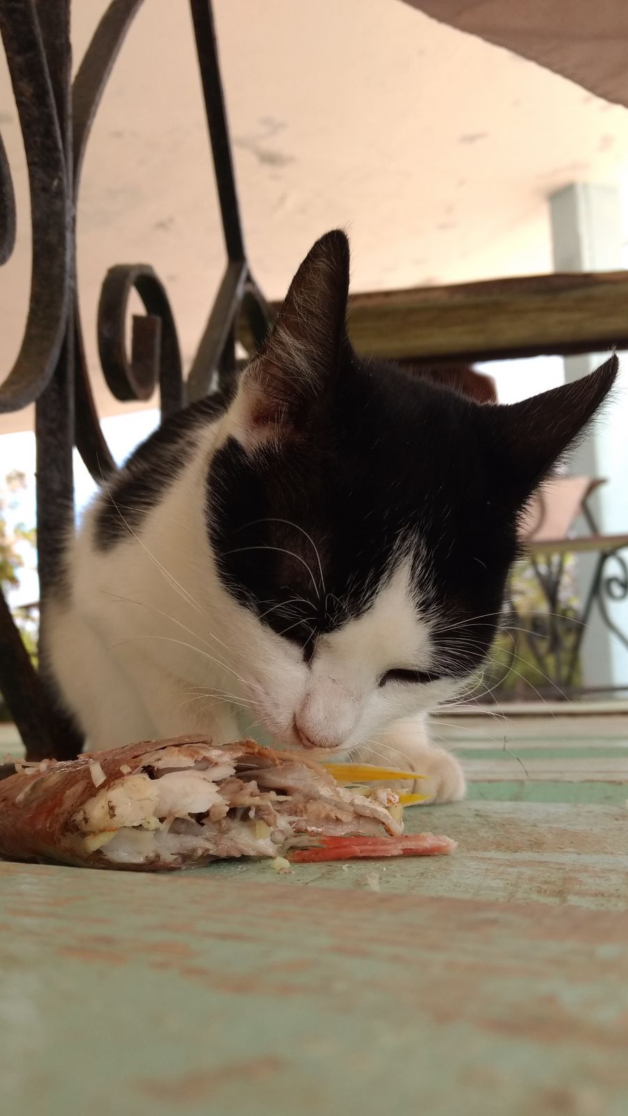 确实饿了,买了一份烤鱼饭,吸引了一只猫猫来分享。