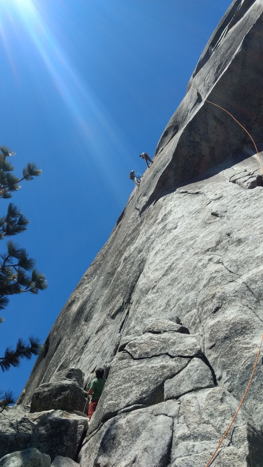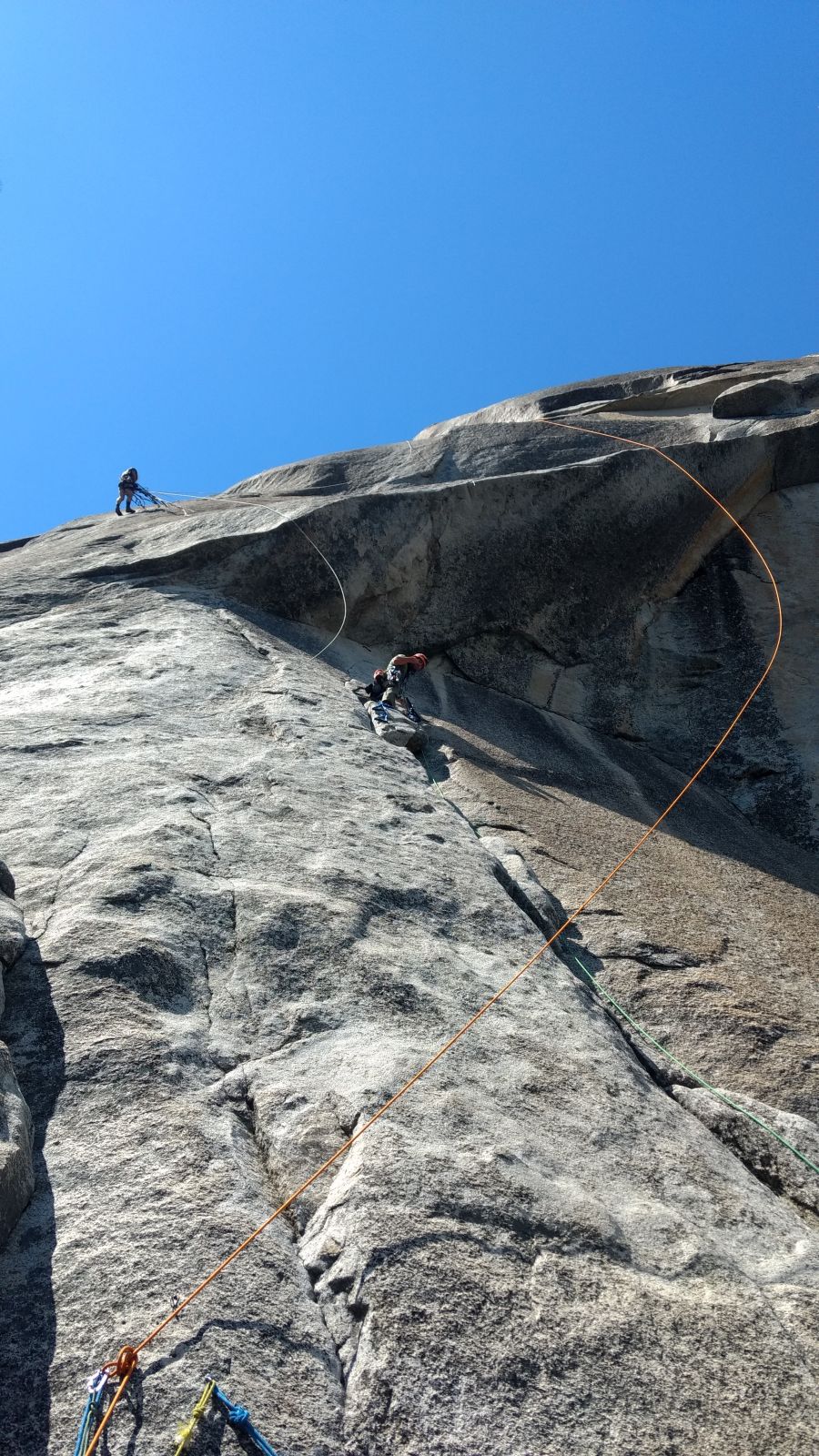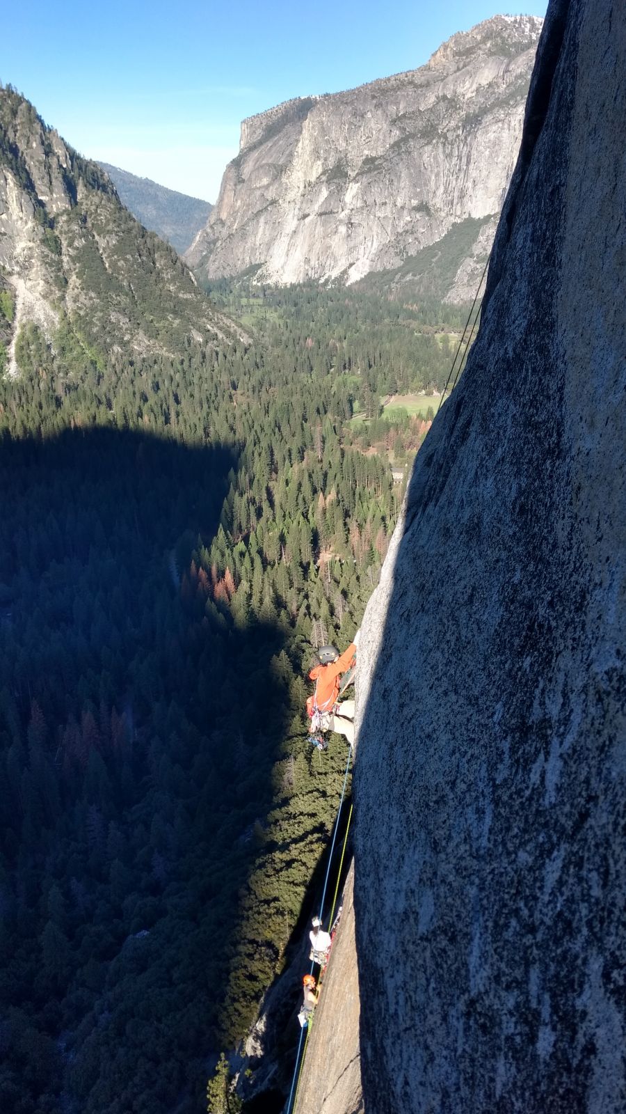 但我们当时碰到的另外3队并没有那么嗨。其中一队跟我们一样也是来爬自己的第一个大墙线,我们两队风格严肃紧张,2天都是天黑前起床,天刚亮就上线。另外2队呢,1队从平台开始爬左边的其它线路:Southern Man,1队是在优胜美地国家公园里工作的岩友,2天都是在夜攀。