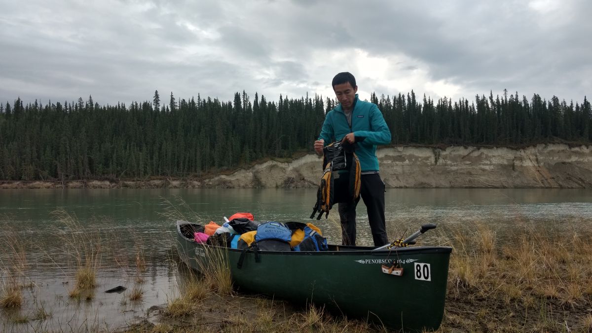 育空河河水平静,几乎没有白浪,如果你不想划,可以只用河速漂流向前。这里河道弯曲多变,笨笨的理工脑袋却只接受直线前进,而且必须有明确的目标点,否则他就会举着浆傻掉,象机器人一样。所以我们俩基本就是在弯道里不停切内直角线,每次过弯之前,我们都需要奋力的横切过水流,完全不管哪里水流更快,更省力。我只能夸他:你这傻小子有把子力气。心里想的是:咱就不能讲点儿技术嘛。