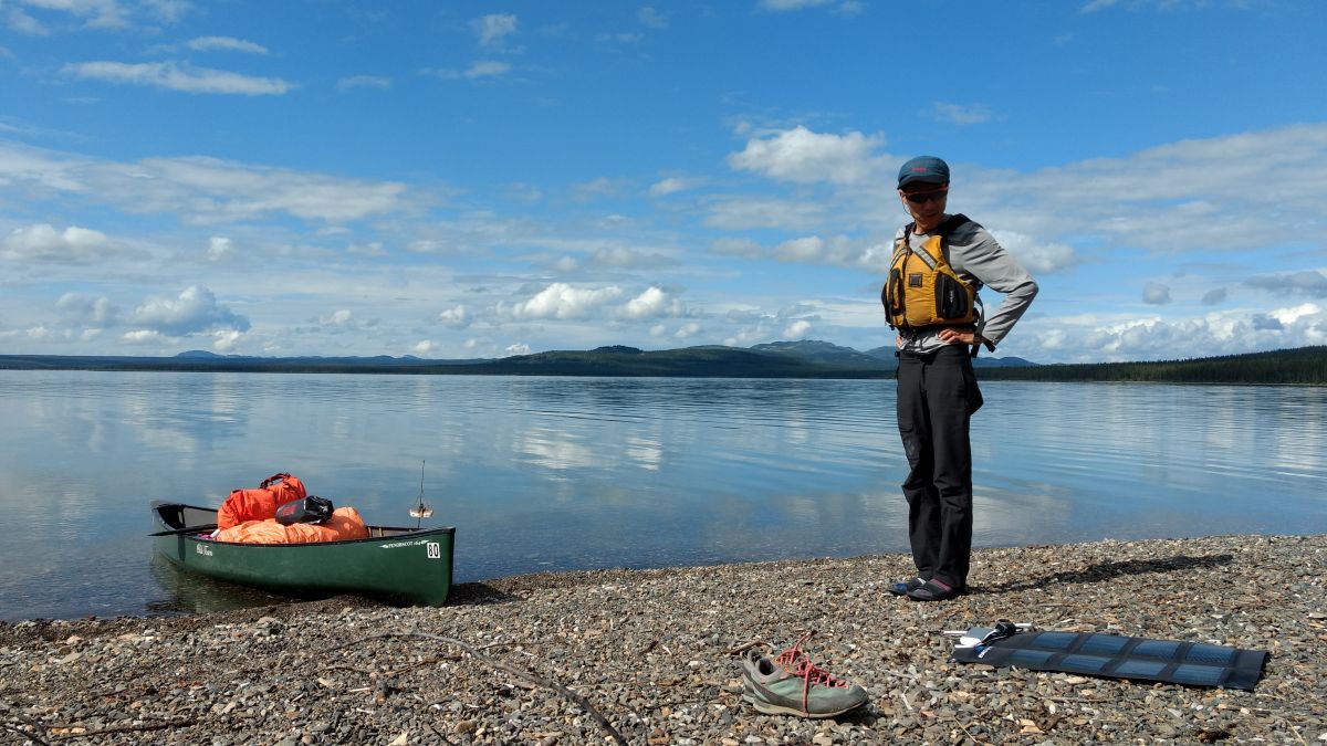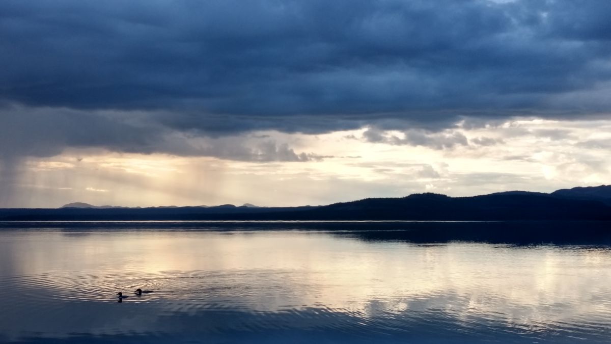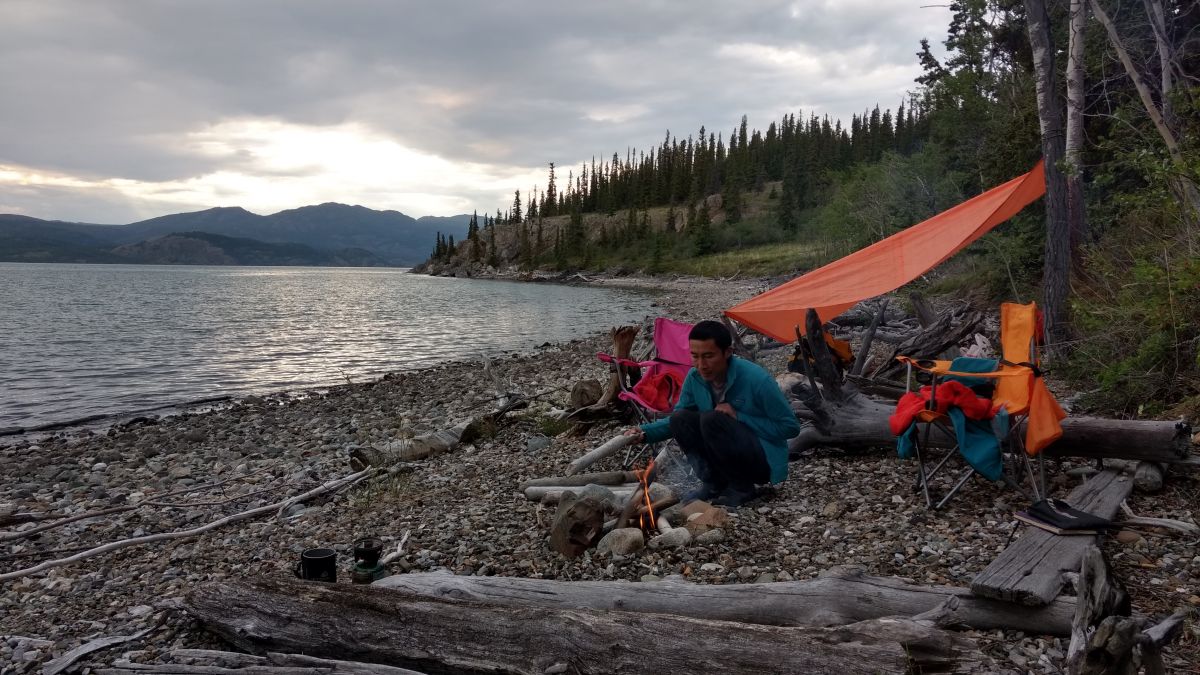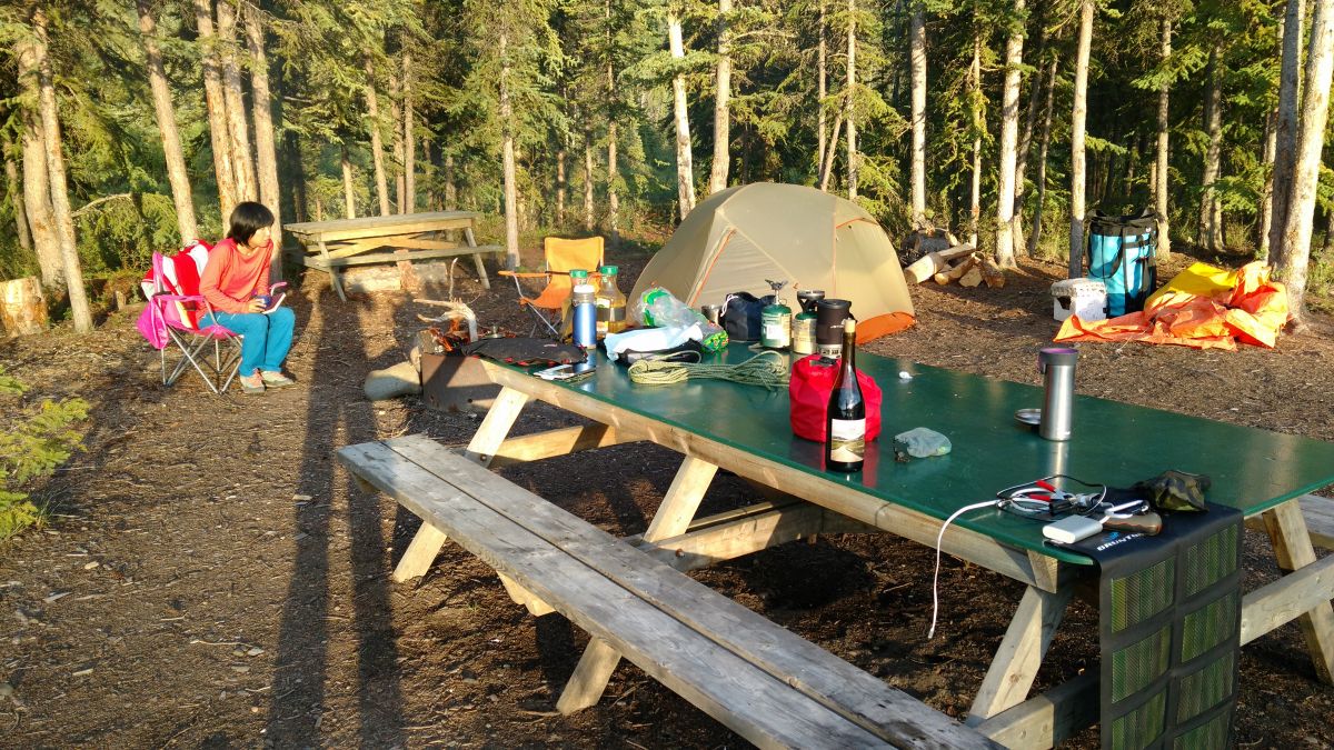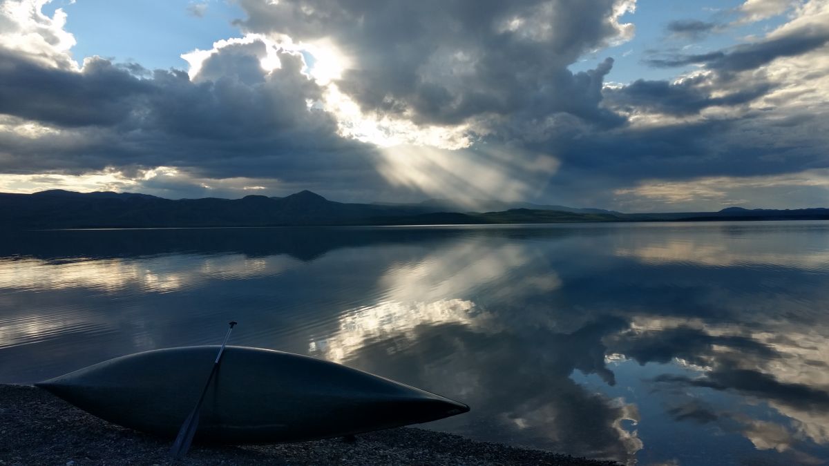 第三晚,我们停在了一处极佳营地。一开始我们并没有看出它哪里好。傍晚,一切收拾停当,笨笨从远处岸边拖来很多木头,生起篝火。我坐在椅子上,拿着kindle,打开了带来的红酒,再望向湖面。嗯,原来如此。这里有着超180度的环湖景观,球形的天空一半在乌云的压迫下降雨,另一半则是乳白的云彩和蓝天。近处几只野鸭呼唤着同伴,慢慢聚在一起,它们梳理羽毛,潜水,拍打翅膀,嘻戏。它们以天地为幕,从一个舞台穿至另一个舞台,让我这个外来者得以欣赏到自然界永不令人厌倦的模样。