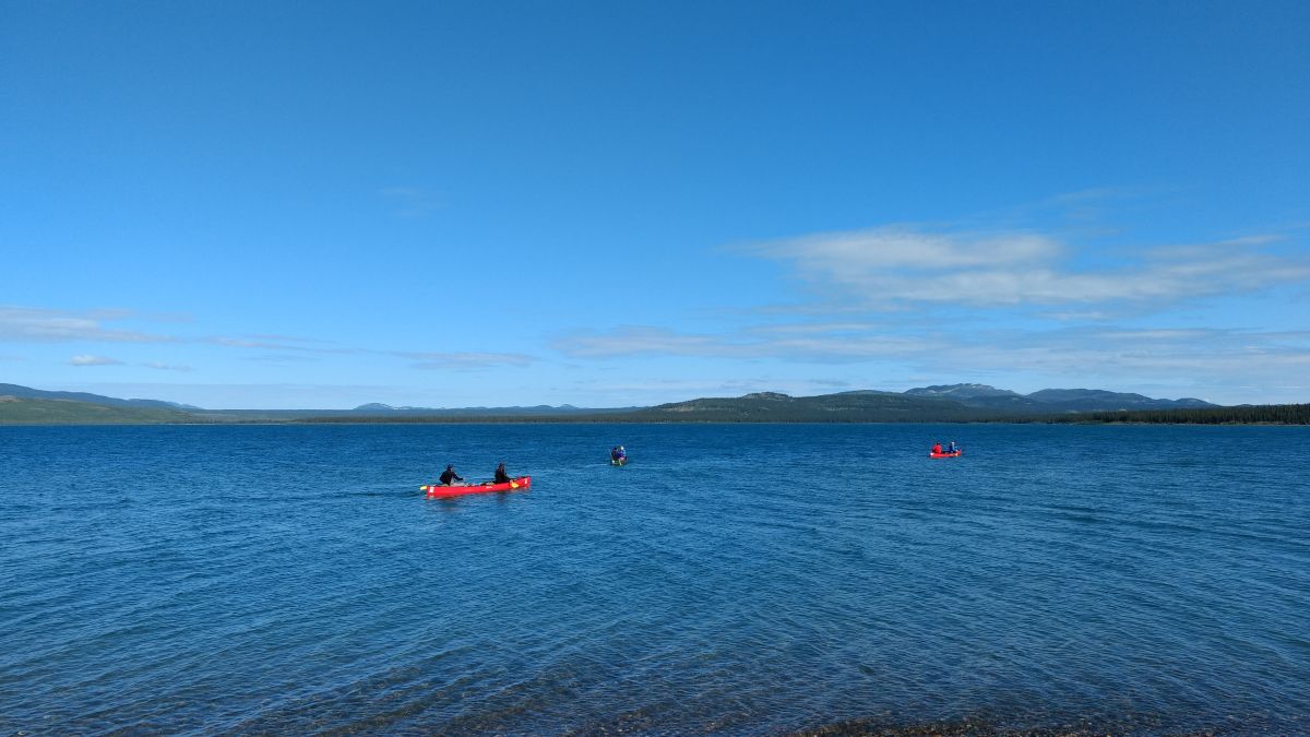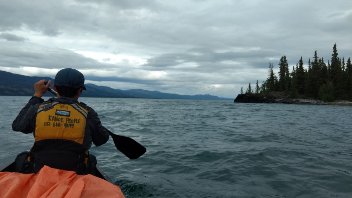 划船上半程的重点是我们要划过Laberge湖,这个湖有50公里长,最宽处5公里,它以天气变化迅速而著名。育空河漂流很少发生事故,而发生过的基本都在这个湖上。曾经有一对德国夫妇丧命于此。Laberge湖的危险主要在于大风,船被打翻,人落水后失温。救生背心不会让你淹死,但不能保证你不失温。