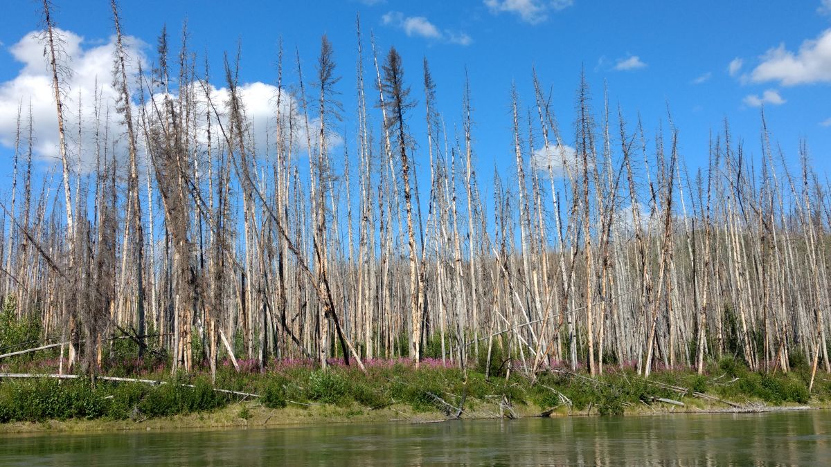 两岸总能看到山火过后的树林,在一处路书上标注1995山火的山坡上,看到有些树干黑黑的,直直的,有些有树皮被烧光,留下树干发着白光。还有一些在树顶留着一丛丛的叶子,样子怪搞笑的。它们也许还要再过几十年才能恢复成森林。但我们不用悲伤。看看枯树下那遍旺盛的Fireweed(火草/柳兰),它是育空地区的标志之花,山火过后,它们总是第一批居民,哪里有死亡,哪里就有新生。