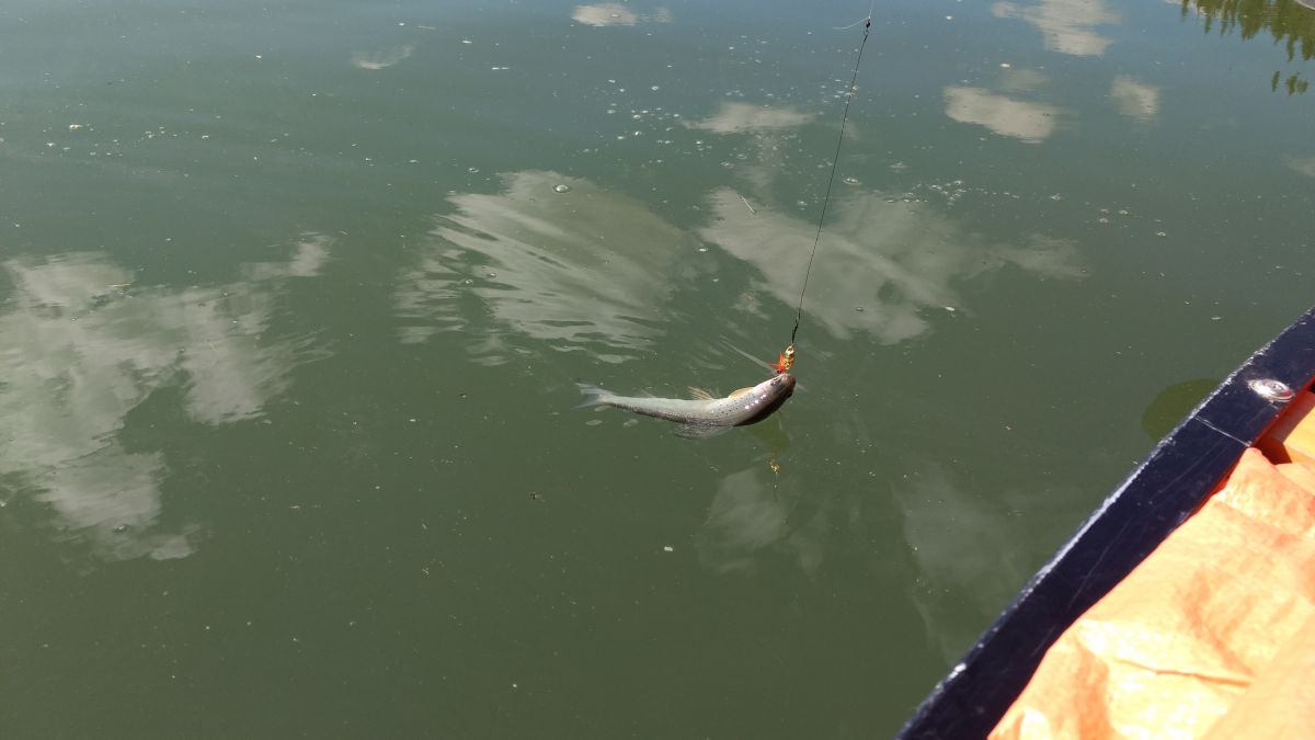 找到一处涡流,我把船栓在树上,然后下秆傻等,偶尔换个位置。等得快睡着了也不见鱼来,把竿扔给笨笨,他钓了一会儿也烦了,笨笨边收线边说:不钓了,然后马上又喊:鱼,鱼!我一看,真的钓到一条鱼啊。开心坏了。