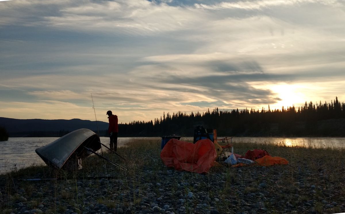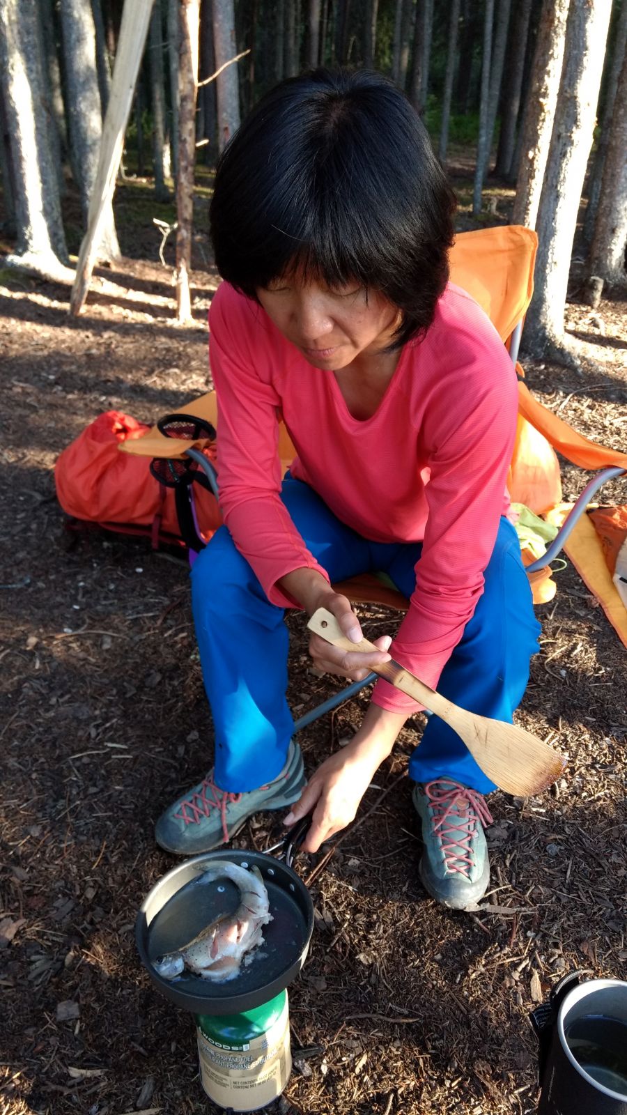 到了营地,正准备做鱼,来了两个老人家,礼貌的问我们:能跟你们共享营地吗,我们人比较多,但太累了,不想继续找营地了。这么大林子,有啥不可以的。聊天得知他们是加拿大人,也是划去dawson,听说我们有15天时间,他捂着脸说:我们只有11天的时间。所以他们每一天都必须定时定量的完成计划,绝不能松懈。再看看我俩,早上9点多起床,中午11点多出发,下午5点多开始找营地,晚上7点多吃饭,然后9点开始玩火。真是太同情他们了。