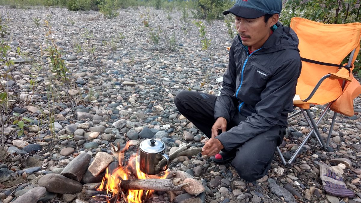从大陆、台湾地区来这里划船的,基本都是中了石田裕辅那本《不去就死》的毒。但从欧洲地区来的人也不少。我们聊过天的有一个7只船的英国青少年队伍,带队老师听说我们钓到过鱼,一时间河面上响起传颂声:那两个中国人,他们钓到了鱼。还有从瑞士来的旅游业堪路人员,但他们这次主要漂一条支流:Teslin河。以及一对瑞典来的小夫妻。最后几天我们一直与一对腐国好基友同行,每天都能听到他们欢快的聊天声。