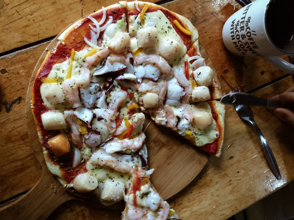 从来没见过这么实在的海鲜披萨,尽管这里出产海鲜,但这个小旅馆毕竟不通车。俩个人在众人艳羡的目光中,坚定的吃完了整个披萨。满足感爆棚的一口气走回了营地。