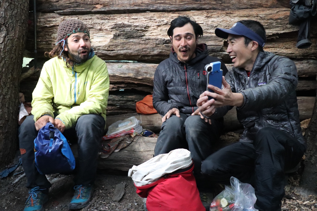 远远看到日本营地的时候,发现怎么有个人趴在棚子上?还有另外一个梳着脏辫的人站在旁边。向导男生走上前去用西班牙文一通聊。我俩则好奇的打量着这个棚子,和满地的烂装备:坏掉的帐篷竿,破帐篷皮,还一个惨不忍睹的拖包。笨笨说:看,它都长蘑菇了。
