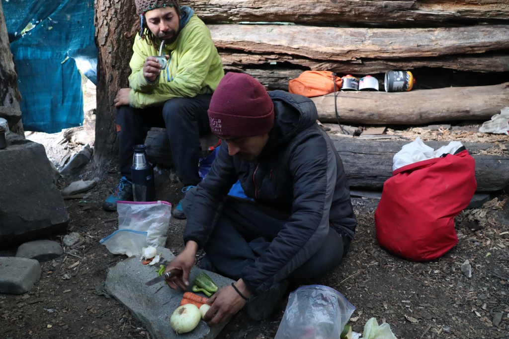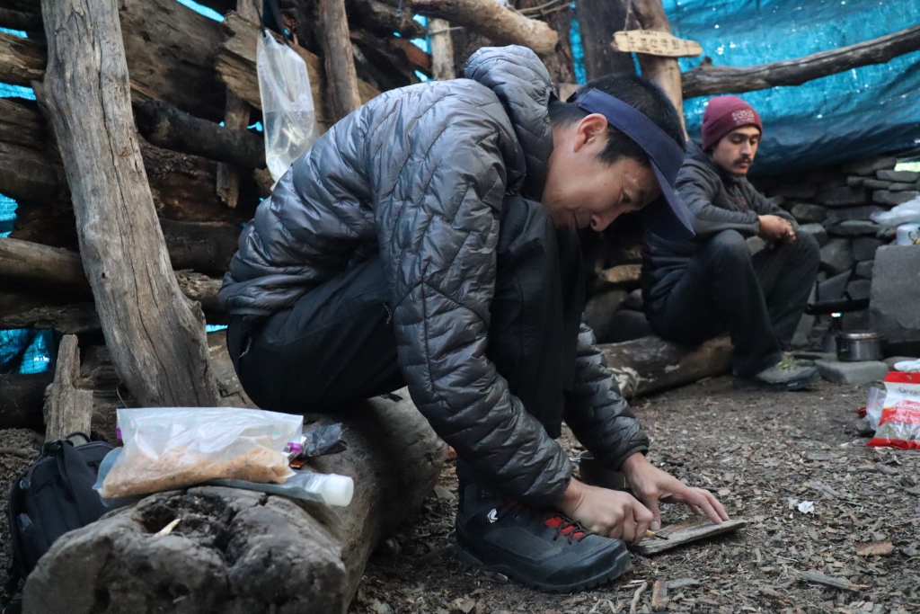年轻的小脏包是智利人,年长一些的是阿根廷人。我们一开始以为他们是看大本营的,有队伍里的其他人在上面爬。后来才知道,他们已经来了5天了,一开始在上面的攀登营地,被大风吹得不行,下到这里等天气。因为实在无聊,就用三天时间把这个棚子上的雨布彻底重新搭建了一番。