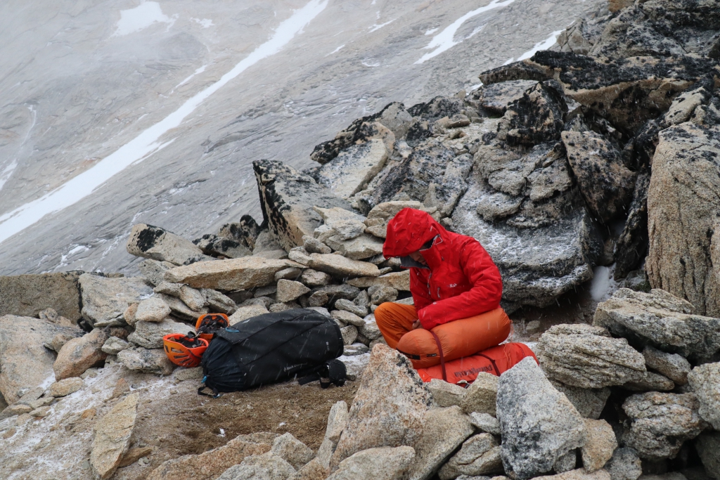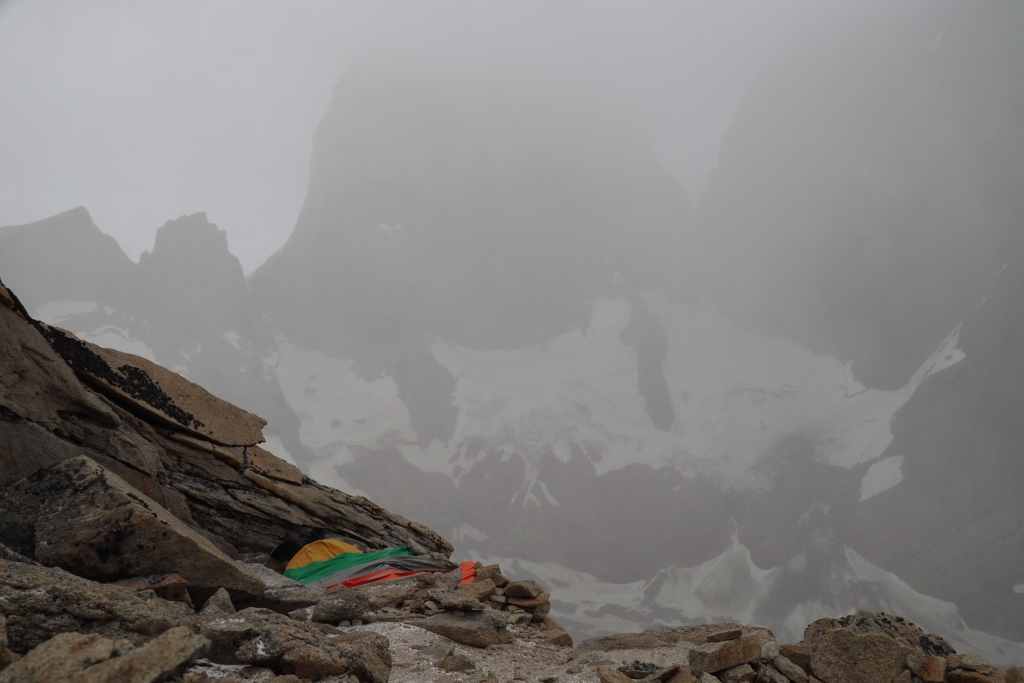 我俩把帐篷支起来,收拾好明天攀登的绳子、装备、衣服、路粮,还把早上的食品也单独放好。Patagonia大风突然就来了,我们躺在睡袋里,听着帐篷在大风里哗啦哗啦的挣扎,我越来越担心它坚持不到明天早上。