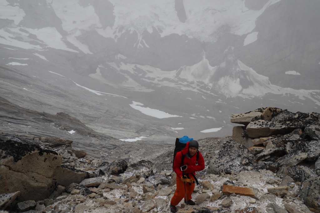 收拾好营地,背上包,看了看下山的石头坡,上面已经落了一层簿簿的雪。在帐篷里时就收拾好一些送给脏包队的装备,笨笨跑到他们帐篷门口,大声喊着:我们走了,装备放在你鞋子里了,好运。