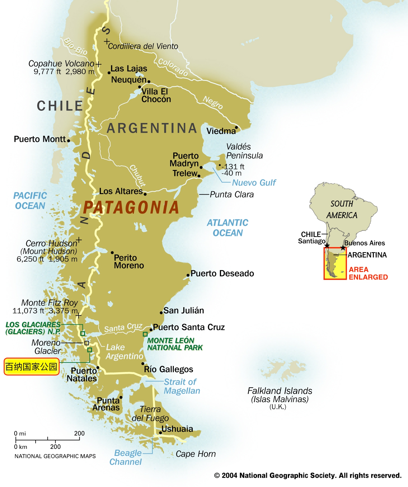 宝典Wikipedia说:“Patagonia是指南美大陆人烟稀少的最南端,由智利和阿根廷两国共享的一片区域。该地区包括安第斯山脉南部的沙漠,东边是潘帕斯平原和草原。巴塔哥尼亚是少数几个在三大洋上都有海岸的地区之一,它的西面是太平洋,东面是大西洋,南面是南极海。”