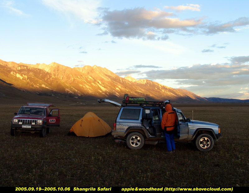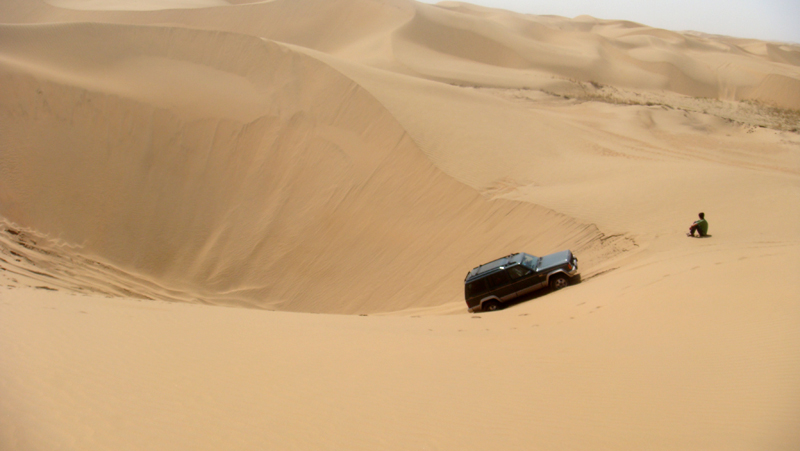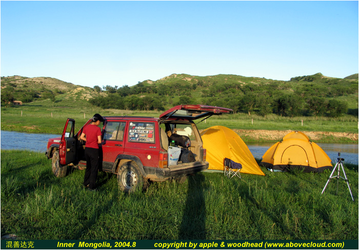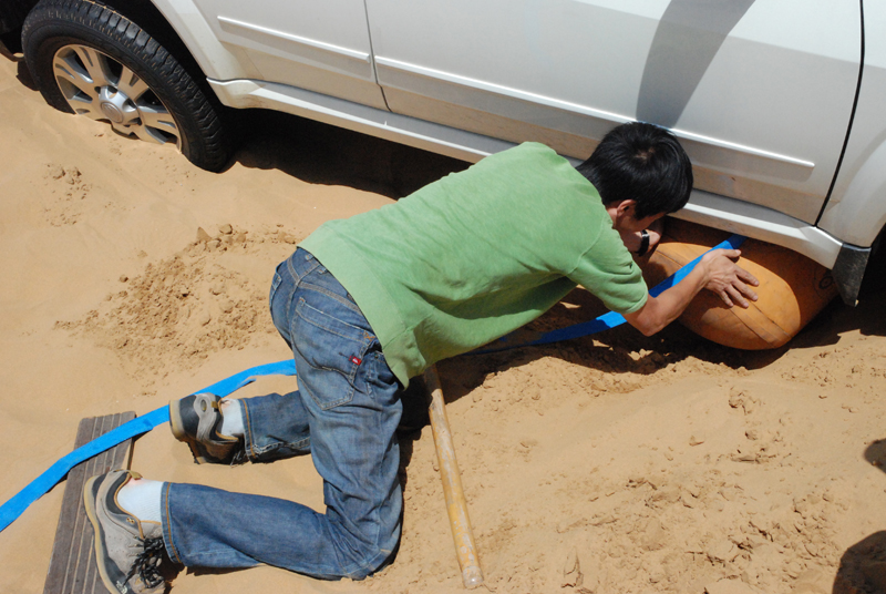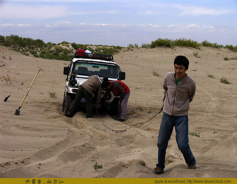 这张是夏天的混善达克,笨笨陷车最惨的一次。我们是头天晚上陷的,折腾到半夜也没挖出来,第二天当地牧民拆了房梁给撬出来的: