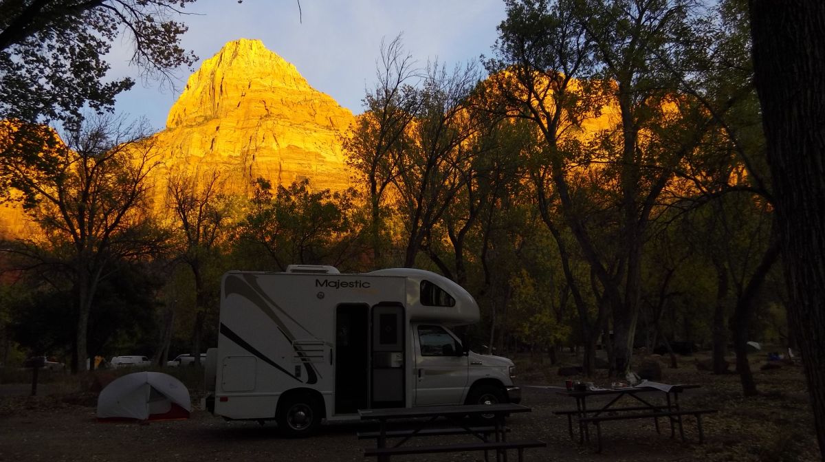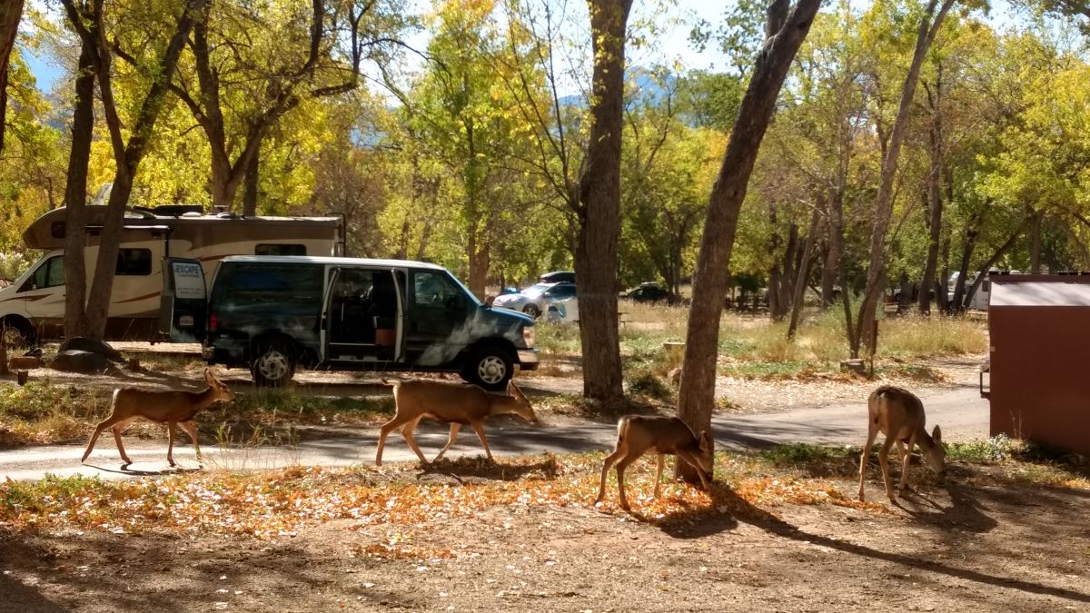 而zion的营地管理员最尽职,经常开着小高尔夫球车巡场,门口的营地空余信息也是经常更新。我们住的营地在一片小树木里,背后就是红色的岩壁,还有鹿群过来溜湾吃饭。