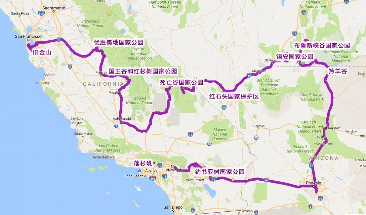 优胜美地国家公园(Yosemite National Park) – 国王谷和红杉树国家公园(Sequoia and king canyon National Park) – 死亡谷国家公园(Death Vally National Park) – 红石头国家保护区(Red rock) – 锡安国家公园(Zion National Park) – 布鲁斯峡谷国家公园(Bryce Canyon National Park) – 羚羊谷 (Antelope)- 马蹄湾(Horseshoe Bend) – 约书亚树国家公园(Joshua Tree National Park)
